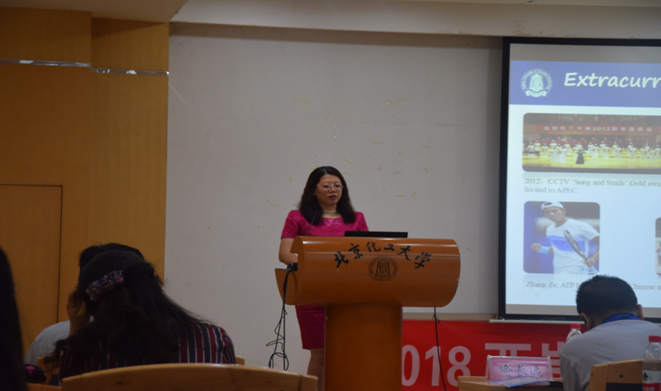 随后,国际处毛立新处长也发表了讲话。她为台湾同胞详细介绍了北京化工大学的发展历史与目前的师资情况,并盛情邀请台湾师生来北化发展与交流。同时,来自中兴大学的王慧民教授也对其所在的中兴大学做出了细致介绍,并表示以后将会邀请我校学生去台进行回访并领略宝岛台湾的美丽风光。
