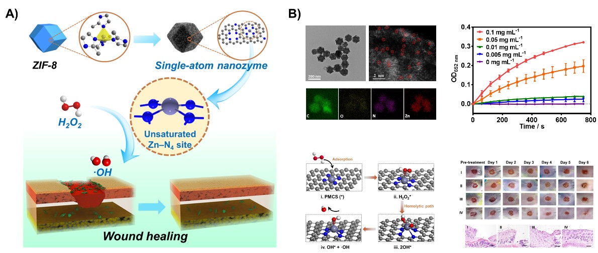 纳米酶是一类能够模拟天然酶催化能力的功能纳米材料,自从2007年Fe3O4纳米材料具有类过氧化物酶活性(Nature Nanotechnology,2007, 2, 577)被报道以来,纳米酶领域的研究迅速崛起。然而,长期以来,一系列新型纳米酶的发现过程都是建立在现有的研究经验和不断试错的基础上,如何模拟天然酶的活性中心结构、理性设计高活性的纳米酶以研究其构效关系是目前纳米酶领域的研究难点。对天然过氧化物酶而言,其活性中心为铁卟啉结构。有研究表明,锌取代的过氧化物酶在一定程度上可表现出更优的催化活性,同时,自然界中锌金属酶同样可直接参与天然的生物催化过程。有鉴于此,该团队通过仿生模拟,发展了一种单原子纳米酶用于伤口消毒应用(见图A)。首先,利用广泛研究的金属有机框架(MOF)材料ZIF-8为前驱体,通过介孔硅裂解保护策略,设计合成了一种Zn−N−C单原子催化剂(SAC);通过酶学实验表征证实其可作为一种高效的单原子过氧化物酶模拟物;通过拉曼(Raman)、X射线光电子能谱(XPS)分析及密度泛函数理论(DFT)计算揭示了其结构与活性的关系。在体外抗菌实验中,该单原子纳米酶实现了高达99.85%的抑菌率,同时,能够在低浓度H2O2情况下有效促进小鼠伤口的愈合(见图B)。相信该项工作能够促进单原子催化剂在生物催化领域的应用,并为纳米酶的设计提供指导意义。