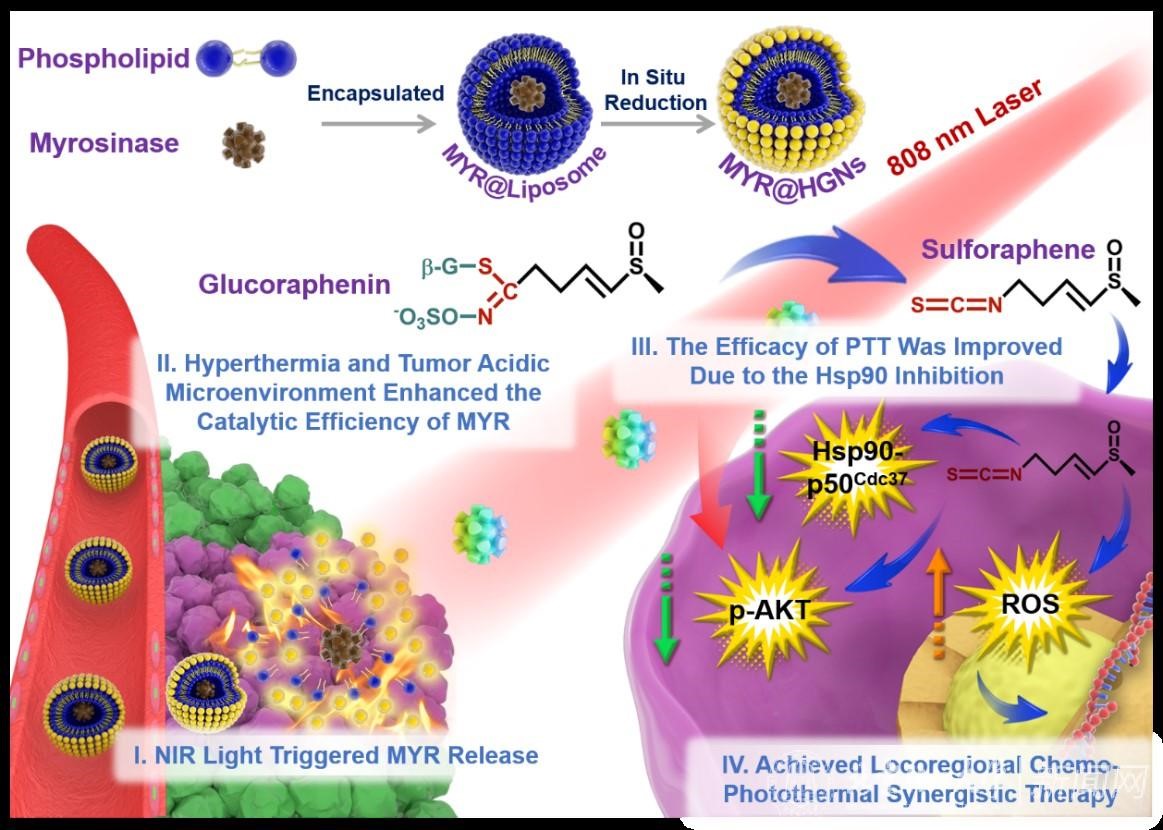 前药是一种常见的肿瘤化疗治疗策略。利用肿瘤组织中过表达的酶帮助前药在肿瘤部位特异性转化。然而,这种前药转化治疗策略依然受限于内源酶种类少、可调节性差等。为了扩大前药的范围,研究人员尝试采用MOF、有机聚合物等载体将外源酶靶向递送至肿瘤部位。但酶的不可控释放依然是不可忽视的限制性因素。最近,近红外(NIR)光介导的纳米药物控制释放受到了相当多的关注。受纳米粒子的光热特性的启发,该研究团队设计了一种NIR光控蜂窝状纳米多孔脂质体金载体(HGNs)来包封外源酶,其可在酶活屏蔽状态下通过被动靶向效应递送至肿瘤部位,然后在808 nm激光**下实现肿瘤部位原位生药。与此前的酶-前药治疗方式相比,该技术具有如下优势:1)封装于脂质体金内的外源递送酶可有效屏蔽酶活,避免了全身响应造成的系统性毒性,同时有效增加酶在肿瘤部位的积累;2)通过近红外光激活外源酶在肿瘤部位定点释放,实现了前药转化的时空靶向性;3)由近红外**脂质体金引发的温热以及肿瘤部位固有的微酸环境可以提升酶的催化活性,从而大幅度提高前药的转化率;4)化疗药物在通过抑制PI3K-AKT信号通路诱导癌细胞凋亡同时抑制热休克蛋白90(Hsp90)的功能,解除了肿瘤细胞对热**的保护,使光热治疗效果得到显著改善。