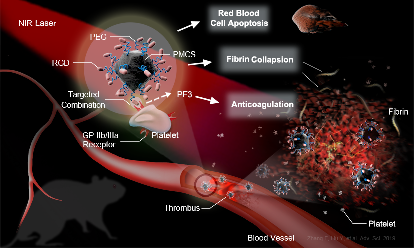 最近,近红外(NIR)光介导的光热治疗受到了相当多的关注。研究表明,部分纳米材料能在近红外光(NIR)照射下通过朗道阻尼效应将光能转化为热能并对材料邻近分子蛋白结构产生破坏。本研究使用靶向纳米颗粒介导的双模态近红外光溶栓,着重于提高生物安全性以及溶栓效应。静脉注射后,偶联RGD肽的PMCS可以主动靶向血栓,并借助NIR光在血栓位点进行能量转化,使纤维蛋白骨架结构及红细胞等重要血栓组成成分崩解,从而实现有效溶栓。与传统的溶栓策略相比,该技术具有如下优势: