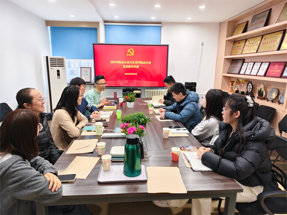 为深入开展树立和践行正确政绩观学习教育,推动党建工作与办公室业务深度融合,提升行政服务效能,助力学院高质量发展,2026年3月6日下午,生命学院办公室与材料学院办公室党员在东校区科技大厦304会议室开展联学共建活动。本次活动由生命学院研究生秘书弥志伟主持,材料学院、生命学院办公室秘书参加。